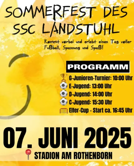 Am 7. Juni 2025 lädt der SSC Landstuhl zum großen Sommerfest ins Stadion am Rothenborn. Mit spannenden Jugendturnieren, einem Elfer-Cup und leckerer Verpflegung ist für Unterhaltung und Stimmung gesorgt – für die ganze Familie!